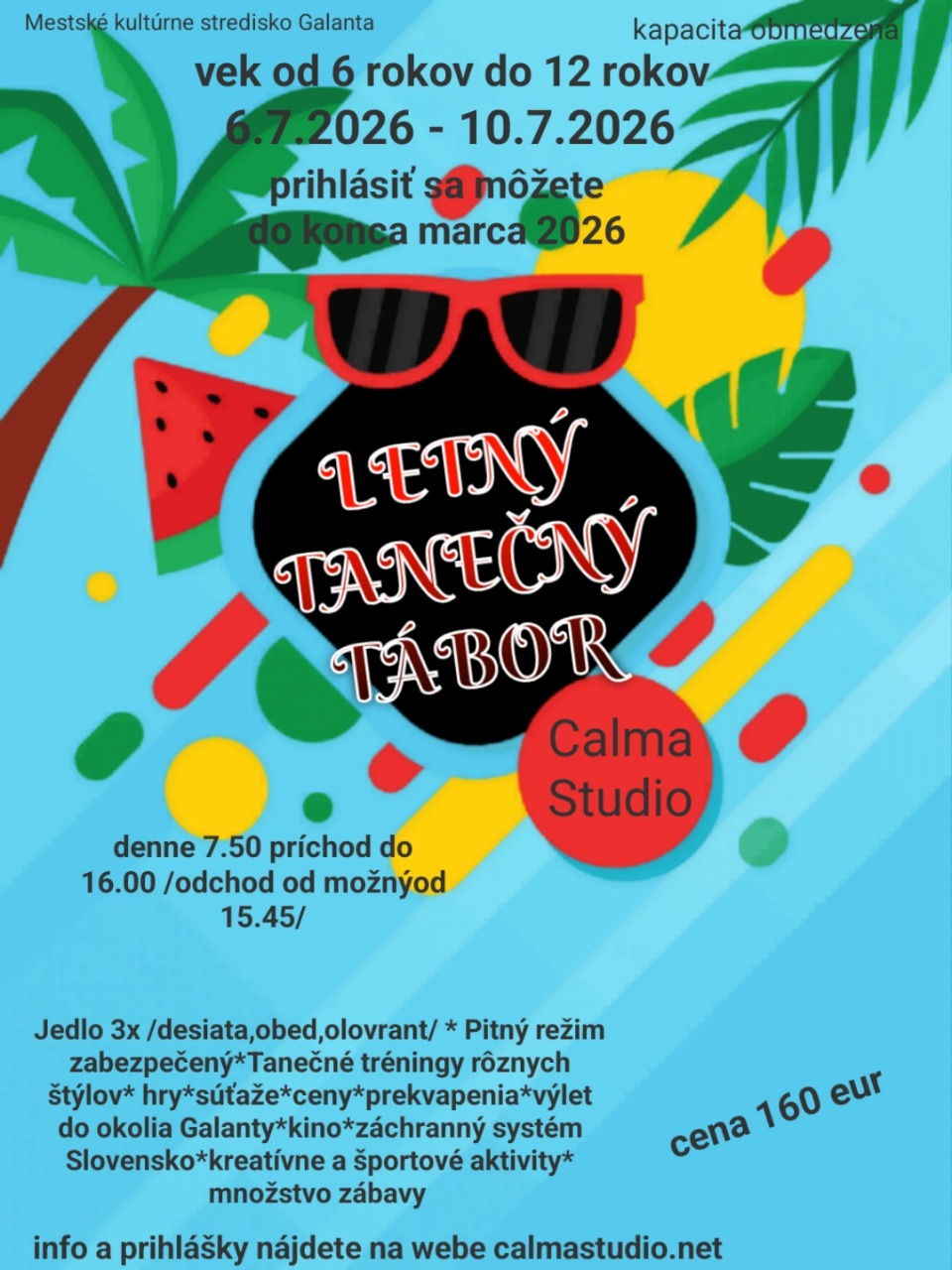 Denný tanečný letný tábor tábor sa uskutoční v priestoroch Mestkého kultúrneho strediska , v našom tanečnom štúdiu. Aktivity športové prebiehajú aj vonku aj vo vnútri podľa počasia.
